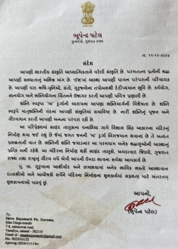 • સાણંદમાં બ્રહ્માંડમાં પહેલું સિંહ આકારનું શિખર વિનાનું દુર્ગા માતાજીની ૨૧ ફૂટ ઉંચી મૂર્તિનું મંદિર અને સૌ પ્રથમ ત્રિશુલ આકાર આશ્રમ બનશે,એક જ જગ્યાએ 51 શક્તિપીઠના દર્શન થશે