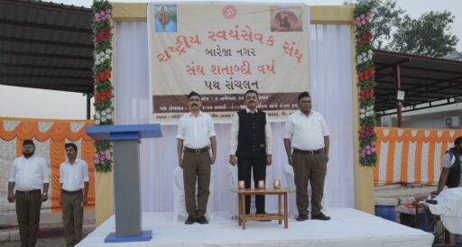 સંઘ શતાબ્દી વર્ષ નિમિત્તે રાષ્ટ્રીય સ્વયંસેવક સંઘ બારેજા નગર દ્વારા પથ સંચાલન અને ભારત માતા પૂજનનો કાર્યક્રમ યોજવામાં આવ્યો