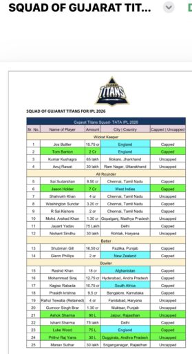 • હોલ્ડર, બેન્ટન અને અશોક શર્માના વ્યૂહાત્મક ઉમેરાઓ સાથે GT સ્ટ્રેન્થન કોર : વેસ્ટ ઇન્ડીઝના ઓલરાઉન્ડર જેસન હોલ્ડરને 7 કરોડમાં અને ઉભરતા પેસ પ્રતિભા અશોક શર્માને 90 લાખમાં ખરીદ્યો