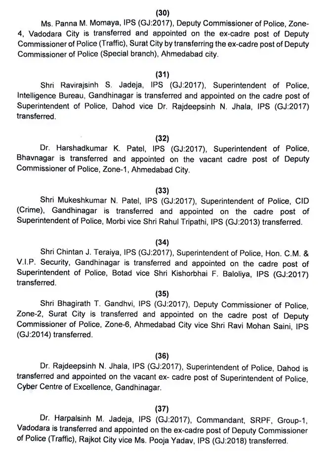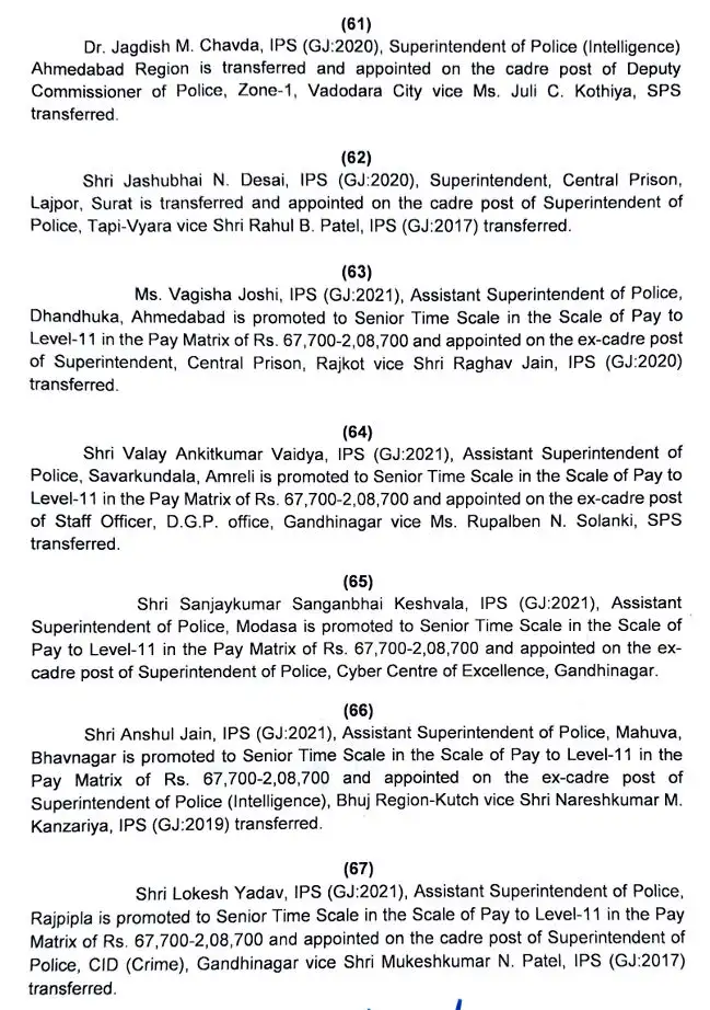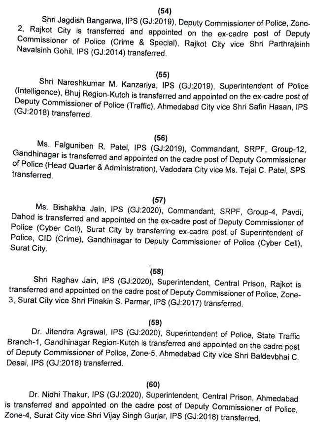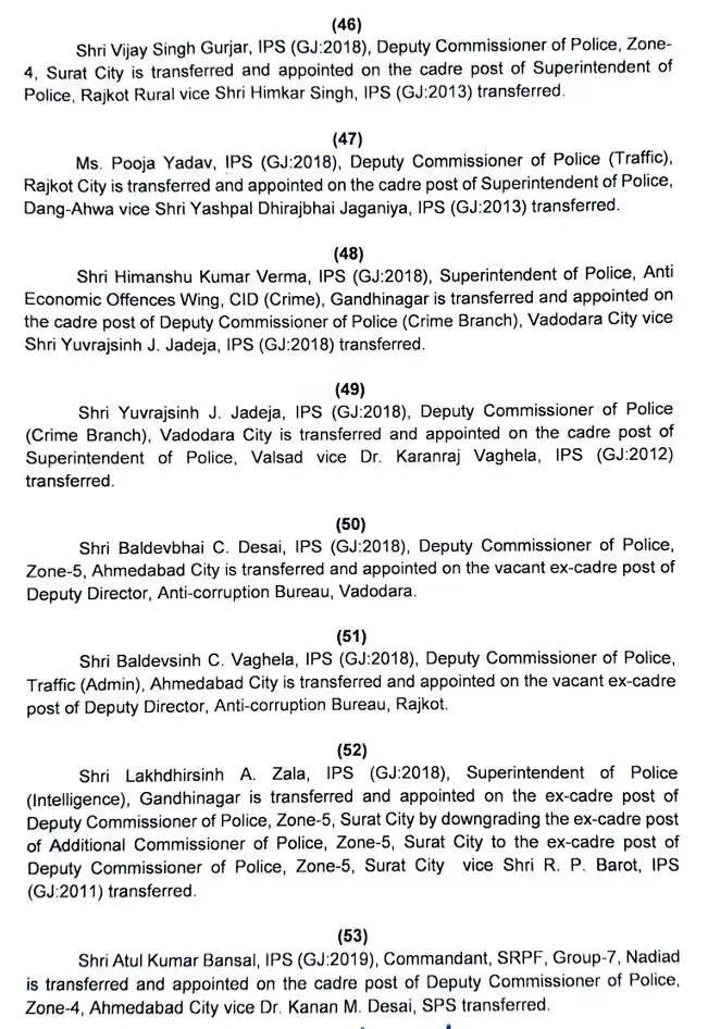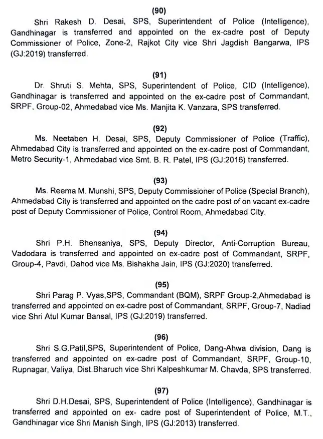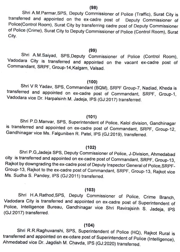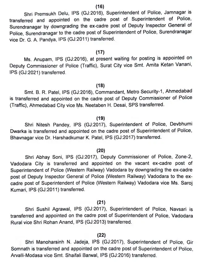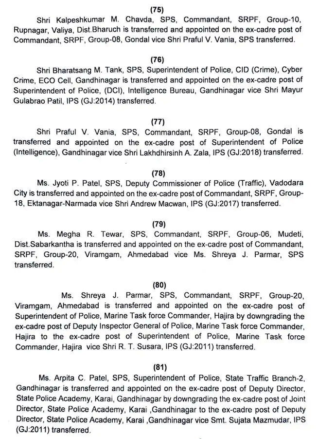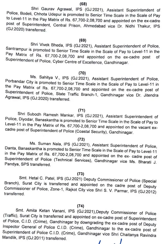 પોલીસ ભવનની અગત્યની જગ્યા જેમ કે સ્ટાફ ઓફીસર, ટેકનીકલ સેલ સી.આઈ.ડી ક્રાઈમ, સાયબર ક્રાઈમ, કોસ્ટલ સિક્યુરીટી, તેમજ જેલ જેવી મહત્વની જગ્યાઓ ઉપર વર્ષ 2021ની બેચના સીધી ભરતીના અધિકારી તો બીજી બાજુ સ્ટેટ મોનીટરીંગ સેલ/સી.આઈ.ડી ક્રાઈમના આર્થિક ગુનાની જેવી મહત્વની જગ્યા ઉપર સિનિયર પોલીસ અધિકારીની નિમણૂંક કરવામાં આવી છે.