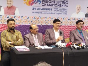 આ ઉપરાંત, કોમનવેલ્થ દેશોના અનેક દિગ્ગજ વેઇટલિફ્ટર્સ તેમની શક્તિ અને કૌશલ્યનું પ્રદર્શન કરશે, જે આ ઇવેન્ટને કોમનવેલ્થ વેઇટલિફ્ટિંગ ફેડરેશનના ઇતિહાસમાં સૌથી સ્પર્ધાત્મક અને યાદગાર ચેમ્પિયનશિપમાંની એક બનાવશે.ભારતીય વેઇટલિફ્ટિંગ ફેડરેશન ગુજરાતના અમદાવાદમાં તમામ રમતવીરો, અધિકારીઓ, મહાનુભાવો અને મહેમાનોનું હાર્દિક સ્વાગત કરે છે – જે તેની સમૃદ્ધ સંસ્કૃતિ, વારસો અને આતિથ્ય માટે જાણીતું શહેર છે.પ્રેસ બ્રિફિંગ દરમિયાન મીડિયા કર્મીઓ સહિત સ્પોર્ટ્સ ઓથોરિટી ઓફ ગુજરાતના પ્રતિનિધિઓ અને રમત વિકાસ અધિકારી ઉપસ્થિત રહ્યાં હતાં.