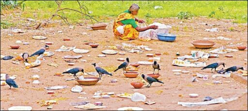 ભુખ અને મજબૂરીની દાસ્તાન વર્ણવે છે આ તસ્વીર. આ તસ્વીર કોઈપણ સંવેદનશીલ માણસનું કાળજુ ચીરવા માટે કાફી છે. તસ્વીર જયપુરના રામનિવાસ બાગની છે. જ્યાં શ્રાધ્ધપક્ષને કારણે કાગડાઓ ખીરખાઈ રહયા છે. તસ્વીરમાં એક વૃધ્ધા પણ કાગવાસમાં મળેલું ભોજન એકઠુ કરી રહી છે. કદાચ દરેક કોળિયું તેનું પેટ ભરવાનું સાધન નહી પણ જીવનનો સંઘર્ષ છે. ફોટો ગ્રાફરે આ પીડા અનુભવી અને દ્રશ્ય કચકડામાં કેદ કર્યુ.