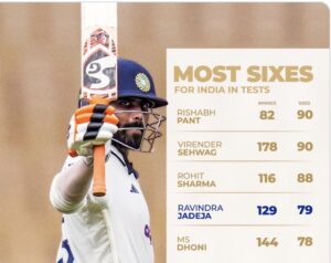 રવિન્દ્ર જાડેજાએ પોતાના ટેસ્ટ કરિયરના 7,111મા બોલ પર 79મો છગ્ગા ફટકાર્યા. જ્યારે ધોનીએ 8,104 બોલનો સામનો કરીને 78મો છગ્ગા ફટકાર્યા હતો. ટેસ્ટ ક્રિકેટમાં ભારત માટે સૌથી વધુ સિક્સર ફટકારનારા ખેલાડીઓની યાદીમાં જાડેજા ત્રીજા સ્થાને છે. રિષભ પંત અને વીરેન્દ્ર સેહવાગ 90 છગ્ગા સાથે ટોચ પર છે. રોહિત શર્મા 88 છગ્ગા સાથે ત્રીજા સ્થાને છે.