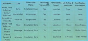 નવા લોન્ચ થયેલા ફોર્ટિફાઇડ લોટના બ્રાન્ડ છે – રાધે માખન (ભાવ્યા ફૂડ પ્રોડક્ટ્સ), માધવન ભોગ (ઋદ્ધિ સિદ્ધિ ગ્રેઇન પ્રોસેસિંગ), રાજભોગ (રાધાજી પ્રોટીન), રાજશ્રી (ગિરિરાજ ફૂડ ઇન્ડસ્ટ્રી), રોહિણી ગોલ્ડ (રોહિણી પલ્સિસ એન્ડ ફૂડ્સ), ઝમઝમ, મુસકાન, શુદ્ધ (ફૉર્ચ્યુન પ્રોટીન) તથા લાલવાણી હેરીઝ ચક્કી આટા (બ્રાઇટ સ્ટાર ફૂડ્સ). બધા પ્રોડક્ટ્સ આયર્ન, ફોલિક એસિડ અને વિટામિન B12 થી સમૃદ્ધ બનાવવામાં આવ્યા છે. મિલર્સ ફૉર ન્યુટ્રિશનએ મિલરોને ટેકનિકલ સહાય, બ્રાન્ડિંગ અને માર્કેટિંગ સપોર્ટ આપ્યું છે.