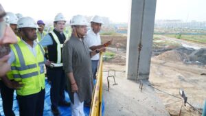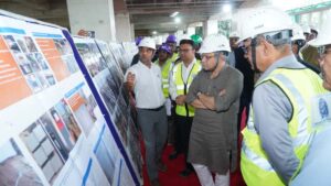 કેન્દ્રીય રેલ્વે મંત્રી શ્રી અશ્વિની વૈષ્ણવે આજે અમદાવાદના સાબરમતી ખાતે મુંબઈ-અમદાવાદ હાઇ સ્પીડ રેલ (બુલેટ ટ્રેન) પ્રોજેક્ટના મુખ્ય બાંધકામ સ્થળોની મુલાકાત લીધી. મંત્રીએ સાબરમતી હાઇ સ્પીડ રેલ (HSR) સ્ટેશન, HSR મલ્ટિમોડલ ટ્રાન્સપોર્ટ હબ અને રોલિંગ સ્ટોક ડેપો પર ચાલી રહેલા કાર્યોની સમીક્ષા કરી.