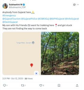 ઘટનાની વિગત અનુસાર, સુભાષિની એમ. નામની એક મહિલાએ X (ટ્વિટર) પ્લેટફોર્મ પર ગુજરાત પોલીસને ટૅગ કરીને જાણકારી આપી હતી કે નર્મદા જિલ્લામાં ટ્રેકિંગ માટે ગયેલા તેમના દીકરા સહિત પાંચ યુવાનો રસ્તો ભૂલી ગયા છે અને ફસાઈ ગયા છે.