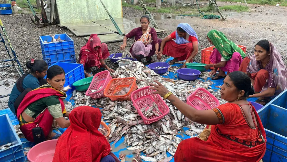 Bipin Tankaria/BBCગુરુવારે જાફરાબાદમાં માછલીનું સૉર્ટિંગ કરી રહેલ મહિલાઓ