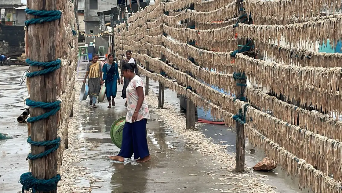 વરસાદ વચ્ચે જયારે બીબીસી ગુજરાતીની ટીમ ગુરુવારે જાફરાબાદ પહોંચી તો જોવા મળ્યું કે લાકડાના થાંભલાઓ વચ્ચે બાંધેલાં દોરડાં પર સૂકવેલી બૂમલા માછલીઓ કોહવાઈને દોરડાની નીચે ઢગલો થઈ રહી હતી અને ક્યાંક-ક્યાંક મજૂરો આ રીતે સડી ગયેલી માછલીઓને દરિયામાં પાછી ફેંકી રહ્યા હતા.
