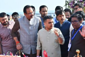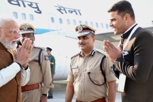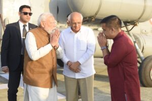 દ્વાદશ જ્યોતિર્લિંગમાંના પ્રથમ જ્યોતિર્લિંગ શ્રી સોમનાથ મહાદેવના સાનિધ્યમાં યોજાઈ રહેલા ‘સોમનાથ સ્વાભિમાન પર્વ’માં સહભાગી થવા વડાપ્રધાન શ્રી નરેન્દ્રભાઈ મોદી આજે સોમનાથ આવી પહોંચતા મુખ્યમંત્રી શ્રી ભૂપેન્દ્રભાઈ પટેલે તેમનું ભાવભીનું સ્વાગત કર્યું હતું.હેલિપેડ ખાતે વડાપ્રધાનશ્રીના સ્વાગત-સત્કાર માટે નાયબ મુખ્યમંત્રી શ્રી હર્ષભાઈ સંઘવી, શિક્ષણ મંત્રી શ્રી ડો. પ્રદ્યુમનભાઈ વાજા, માંડવી ધારાસભ્ય શ્રી અનિરૂદ્ધભાઈ દવે, કલેક્ટર શ્રી એન.વી.ઉપાધ્યાય, જિલ્લા પોલીસ અધિક્ષક શ્રી જયદિપસિંહ જાડેજા, અગ્રણી શ્રી ડૉ.સંજયભાઈ પરમાર ઉપસ્થિત રહ્યાં હતાં.