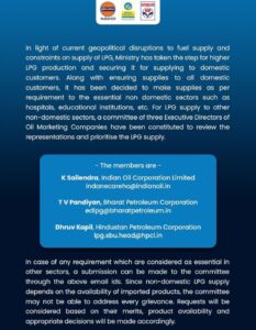 આવશ્યક બિન ઘરેલું સેક્ટર જેવા કે સ્કૂલ, હોસ્પિટલ સિવાયના બિન ઘરેલું સેક્ટરમાં એલપીજી ગેસના સપ્લાયને ઈન્ડીયન ઓઈલ, ભારત પેટ્રોલીયમ અને હિંદુસ્તાન પેટ્રોલીયમની ત્રણ સભ્યોની સમીતી દ્વારા રીવ્યુ કરવામાં આવશે. : બિન ઘરેલું ગેસ માટે ત્રણ સભ્યોની કમિટી સમક્ષ મેઇલ થી ગેસની માંગણી કરી શકાશે જ્યારે સમિતિ સ્વીકારે છે કે દરેકની માંગને નહીં સંતોષી શકાય : શું બીજા બિન ઘરેલું સેક્ટરને એલપીજી ગેસના પુરવઠાની સપ્લાય રોકવામાં આવી છે? :